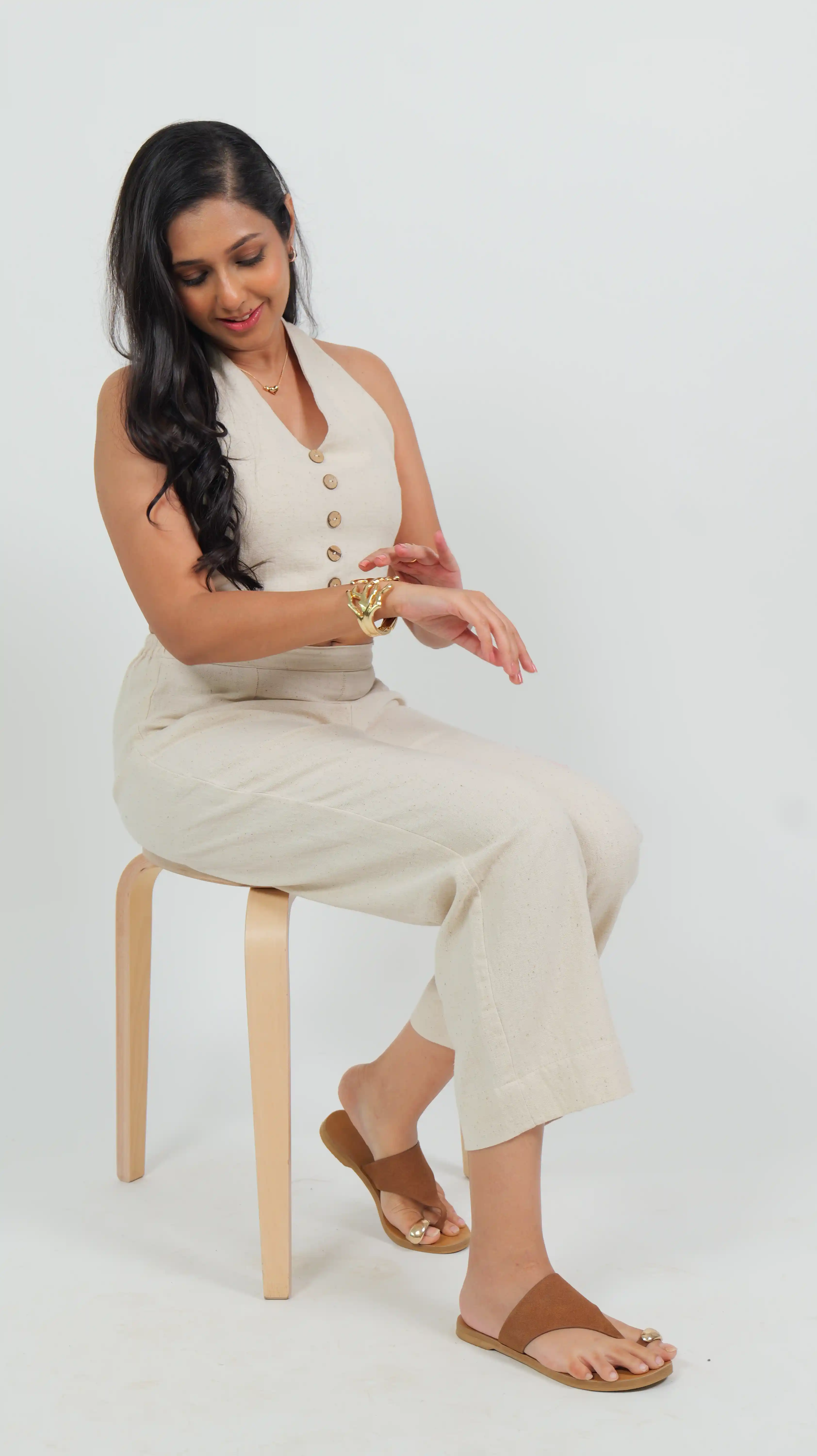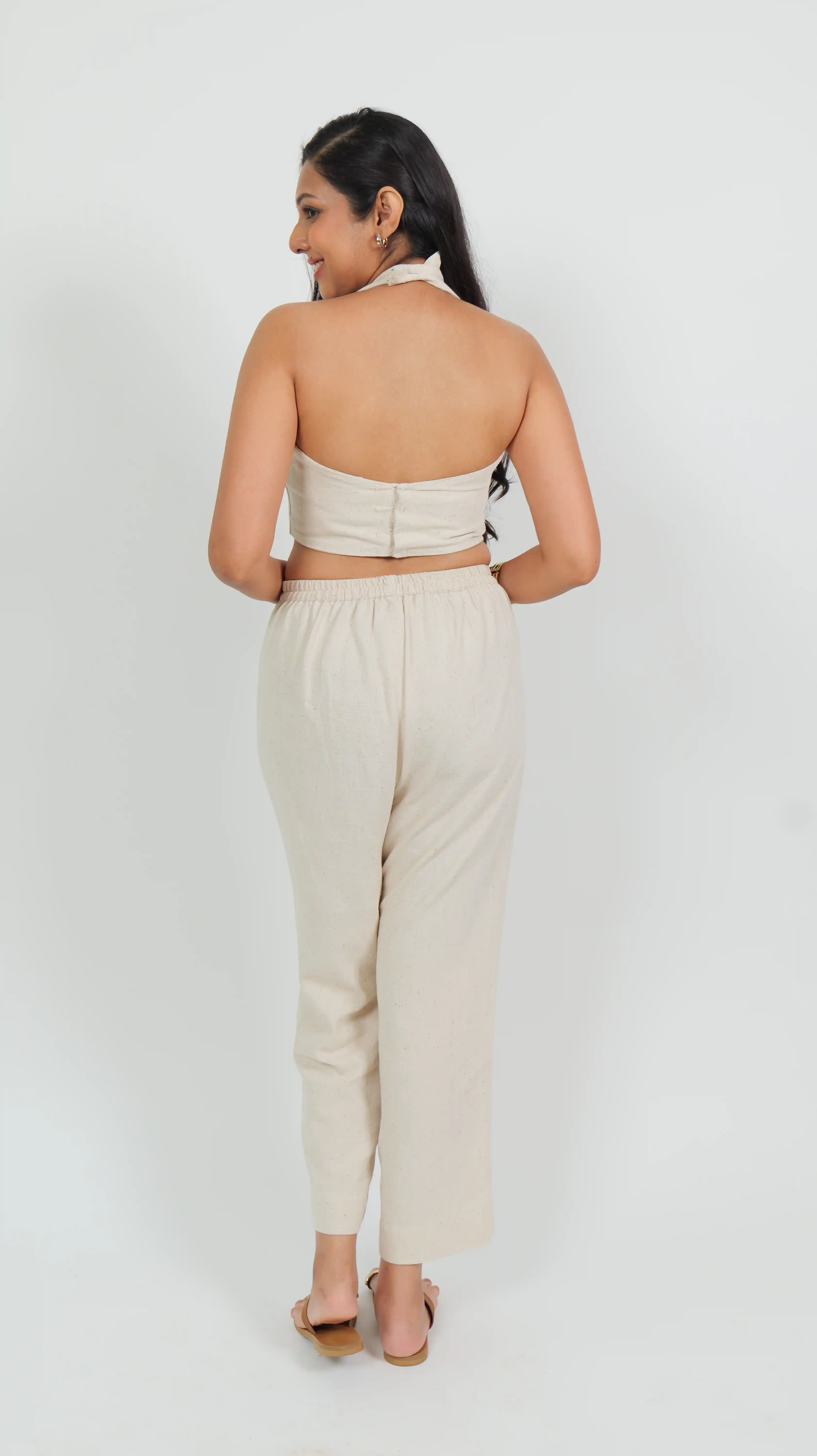 Product Description: Rooted in softness and ease, the Off White Halter Neck Top is a celebration of minimal form and natural rhythm. The halter neck crop top features a clean V-cut neckline and wooden button closure that nods to rustic charm, while the high-waisted straight pants offer grounded structure with effortless flow. Made in undyed Kala cotton, this set feels like calm confidence — pure, breathable, and bold in its simplicity.