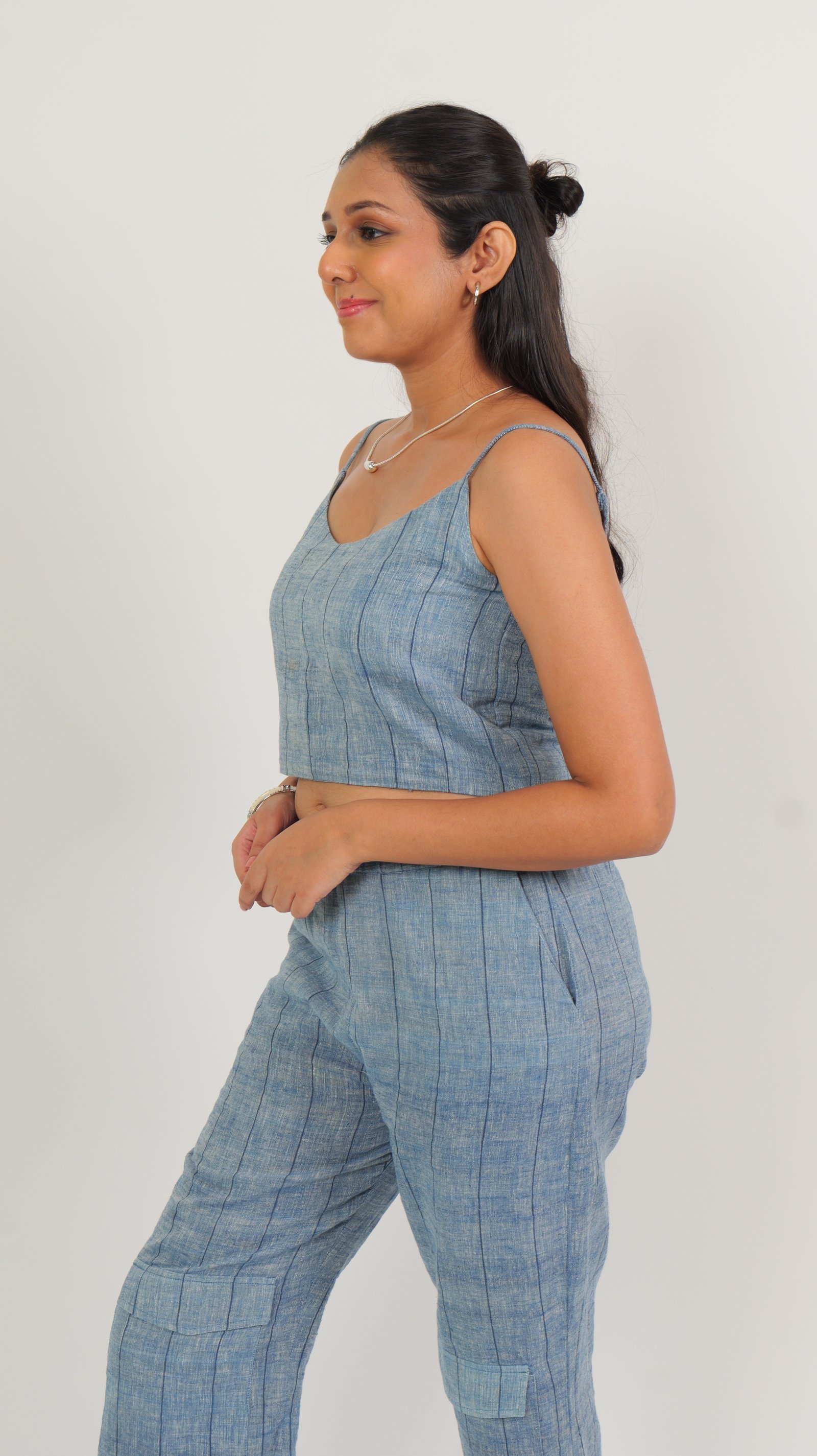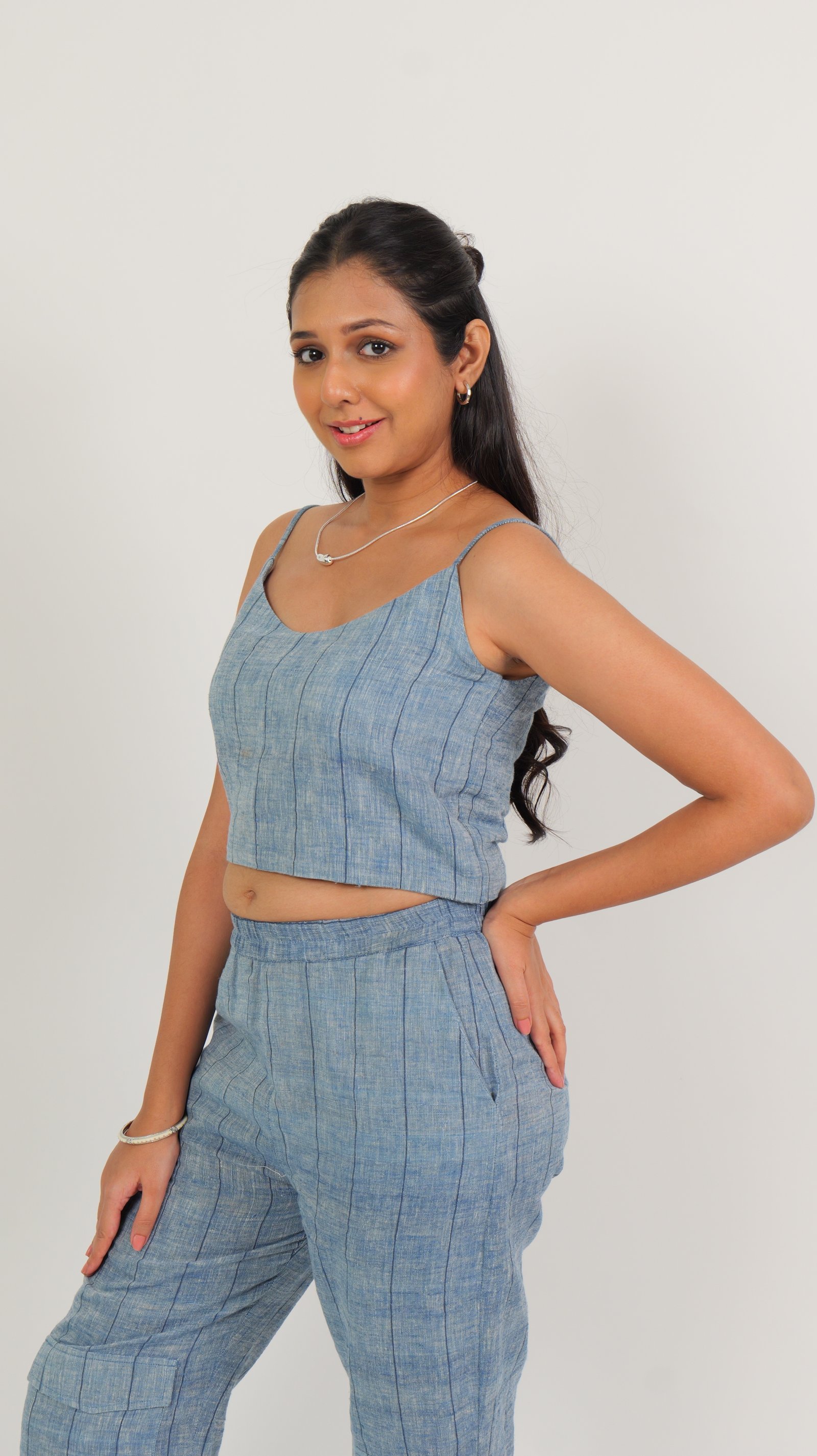 Product Description: Breathe easy in this lightweight Kala Cotton co-ord set, tailored for comfort. Featuring a sleeveless crop top with wide straps and flattering neckline and relaxed high-waisted pants with gentle gathers at the ankle. This set is naturally dyed in subtle indigo-inspired tones with a soft striped weave.