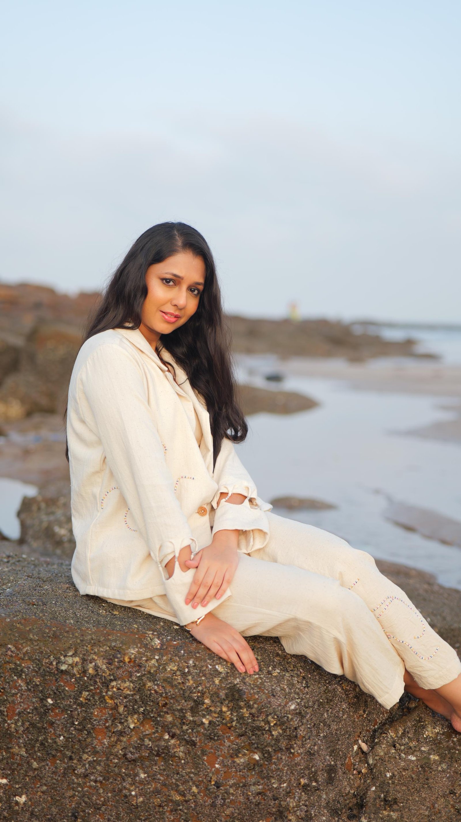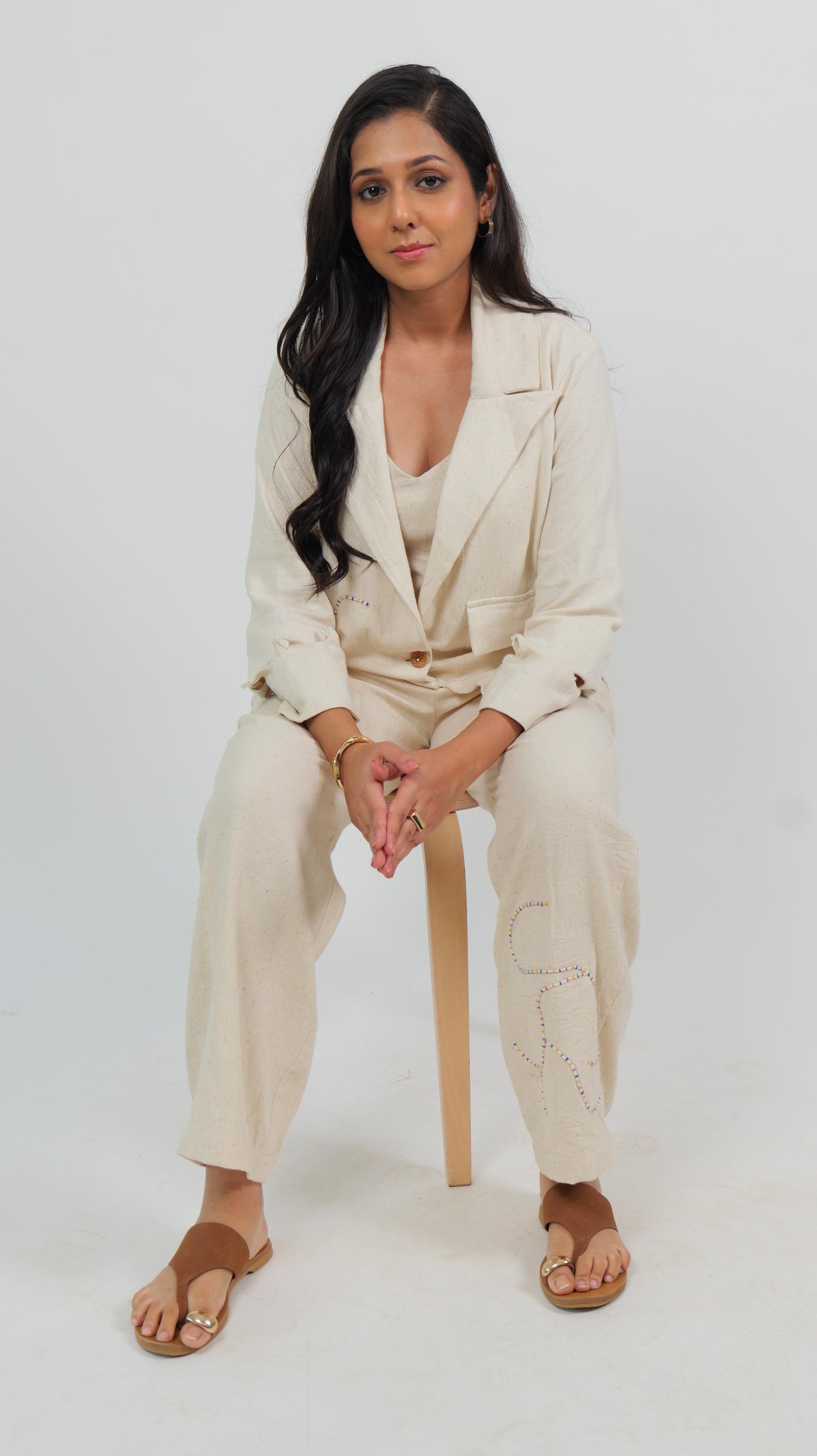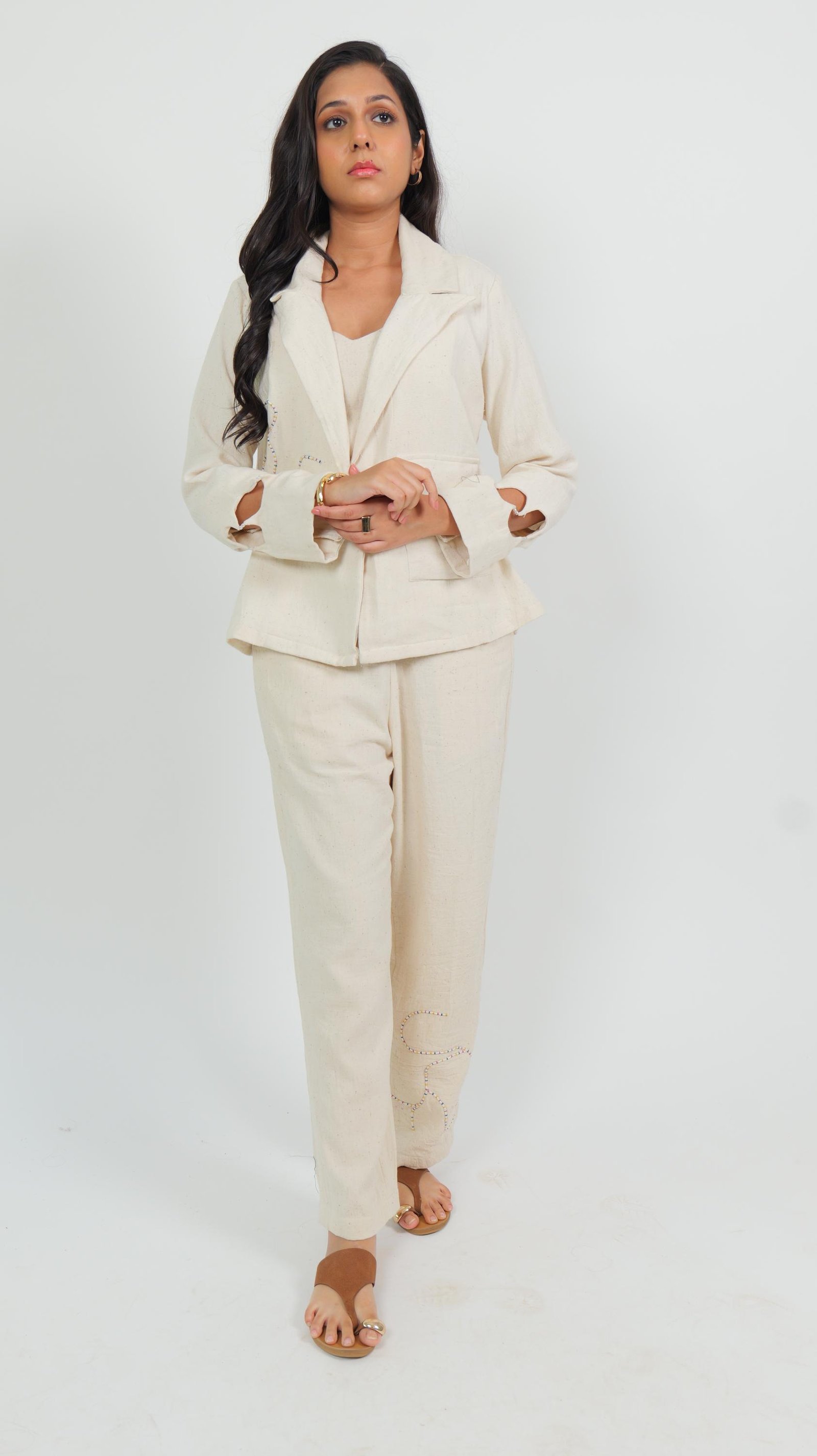 Product Description: Simplicity meets thoughtful detail in this soft off-white co-ord set, crafted from breathable kala cotton fabric. Featuring a gently structured blazer with hand-embroidered wave patterns and subtle slit cuffs with loop button detailing, this look is elevated yet easy to wear.Paired with matching straight-fit trousers, it is versatile, grounded, and beautifully made.