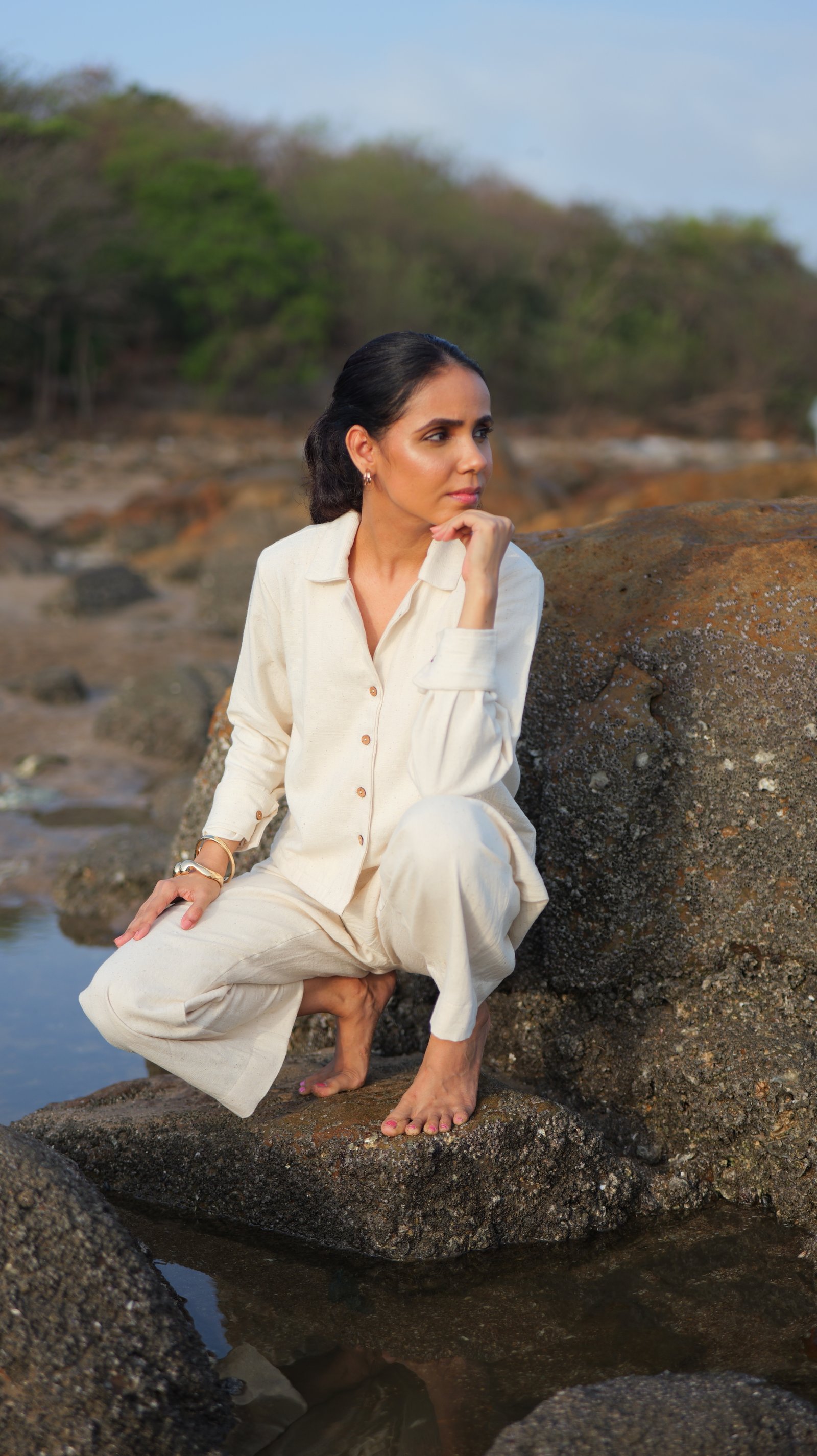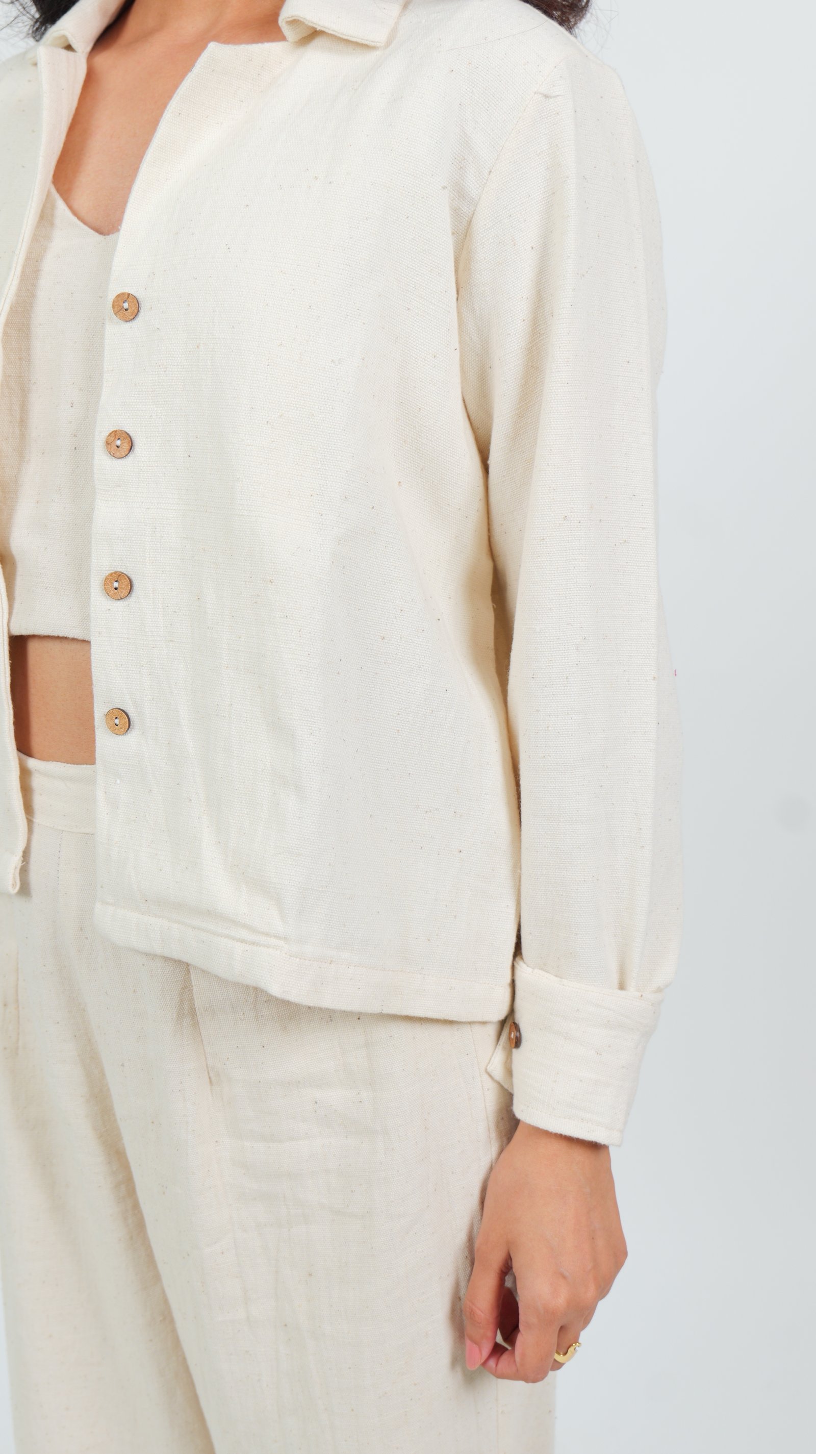 Product Description: Crafted from naturally textured, undyed Kala cotton, the Salt Dune Shirt brings an earthy elegance to your everyday wardrobe. It features a clean button-down front with minimal wooden buttons, a sharp collar, and full-length sleeves — all tailored for a relaxed yet structured fit. The breathable fabric keeps you comfortable through changing weather, while its neutral tone offers effortless styling versatility.