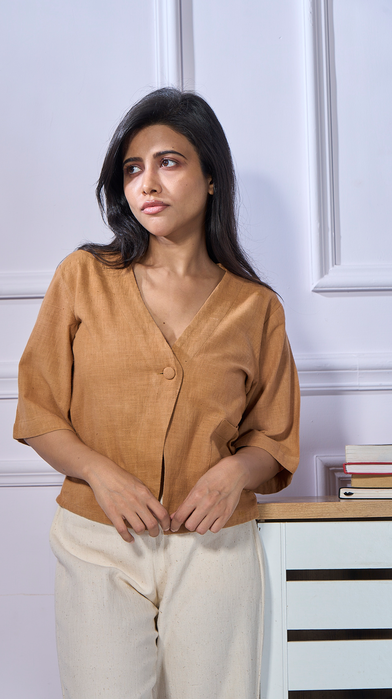 Perfect for slow mornings, easy workdays, weekend cafés, or relaxed travels — this top pairs beautifully with trousers, skirts, or denims while keeping your look grounded, breathable, and effortlessly refined.