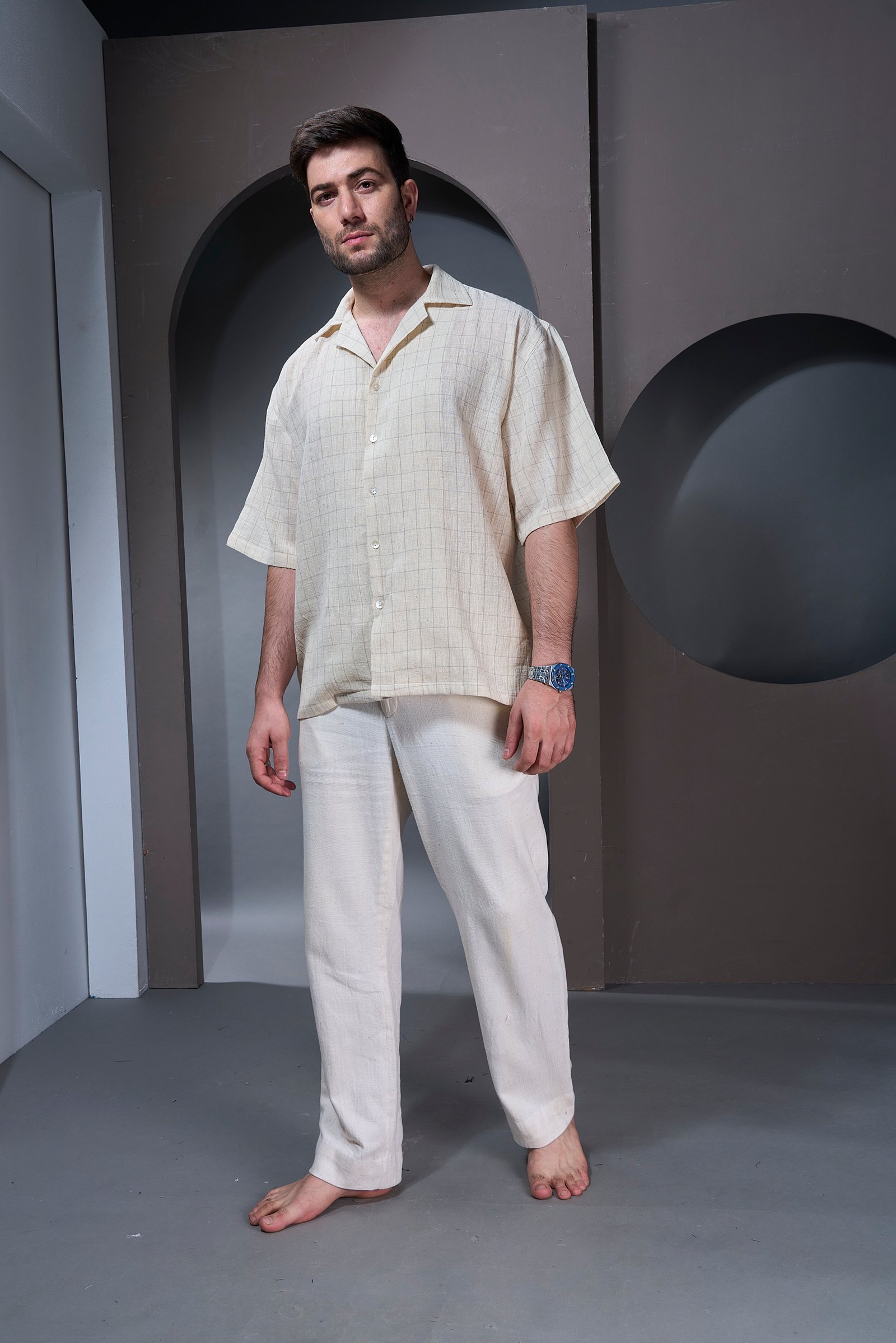 Product Description:The Nomad Grid Shirt is crafted for those who move with ease, curiosity and quiet confidence. Woven from heritage Kala Cotton, its soft grid pattern reflects the balance between structure and spontaneity—like pathways that guide a wanderer but never confine him. The relaxed, open-collar silhouette gives it a breezy, effortless charm, making it ideal for slow days, long journeys and moments when comfort and style naturally meet. Understated yet refined, this shirt brings together breathable craftsmanship and modern-day simplicity in a way that feels grounded, versatile and distinctly timeless.